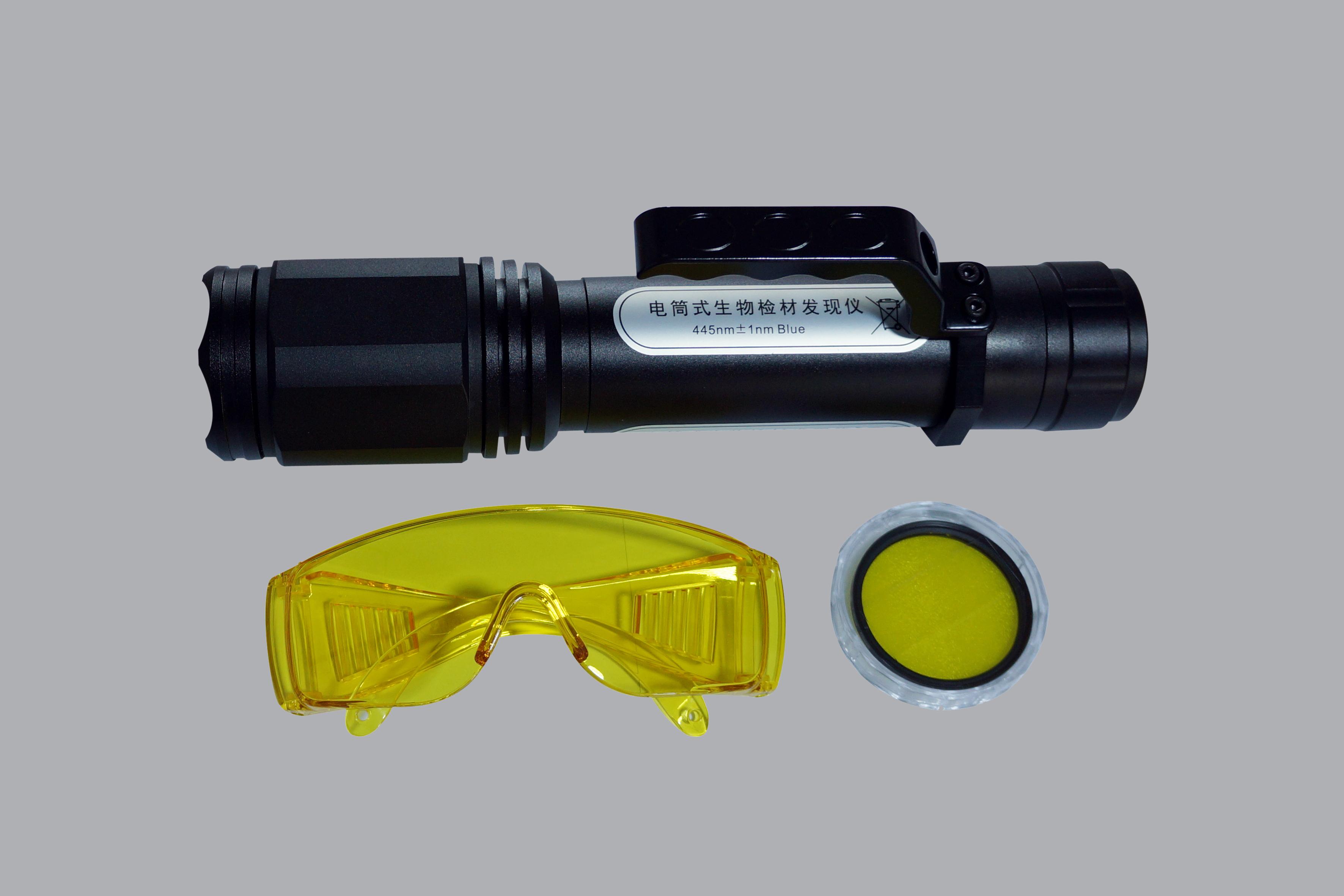 电筒式生物检材发现仪,应用光学技术研发设计生产的一款高科技产品。该产品采用大功率LED芯片,其工作特点为亮灯无延滞现象,光强可调,高亮度纯光学输出可更有效的激发微弱荧光物质。该产品用于现场大范围搜索精斑、尿液斑、唾液、阴道分泌物、血斑等生物检材(不破坏DNA)及纤维、骨骼牙齿碎片、油漆碎片、潜在手印、射击残留物等物证,大大提高现场物证发现提取率和区别能力。配备高品质荧光观察眼镜和拍照滤色片,不会因为激发光源强度高而产生荧光干扰,能对物证发现和拍照达到更好的效果。
